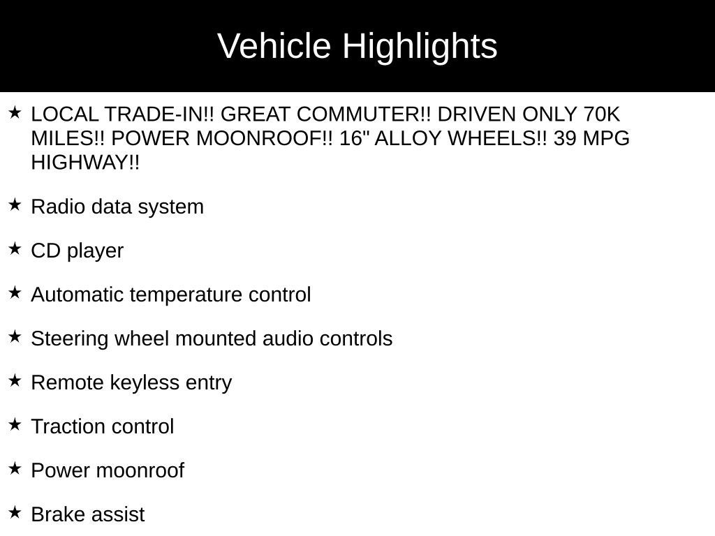 - LOCAL TRADE-IN!! GREAT COMMUTER!! DRIVEN ONLY 70K MILES!! POWER MOONROOF!! 16" ALLOY WHEELS!! 39 MPG HIGHWAY!!