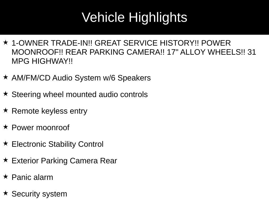 - 1-OWNER TRADE-IN!! GREAT SERVICE HISTORY!! POWER MOONROOF!! REAR PARKING CAMERA!! 17" ALLOY WHEELS!! 31 MPG HIGHWAY!!