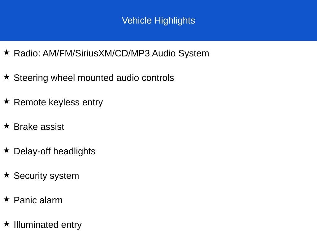 - Radio: AM/FM/SiriusXM/CD/MP3 Audio System -inc: 6 speakers, iPod/USB and MP3 auxiliary input jacks