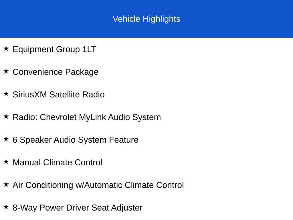 - Bluetooth® for phone personal cell phone connectivity to vehicle audio system and HMI (Human Machine Interface) (Upgraded to Chevrolet MyLink radio with Bluetooth® streaming audio for music and select phones.)