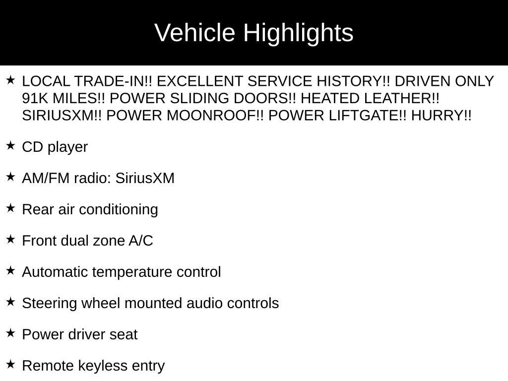 - LOCAL TRADE-IN!! EXCELLENT SERVICE HISTORY!! DRIVEN ONLY 91K MILES!! POWER SLIDING DOORS!! HEATED LEATHER!! SIRIUSXM!! POWER MOONROOF!! POWER LIFTGATE!! HURRY!!