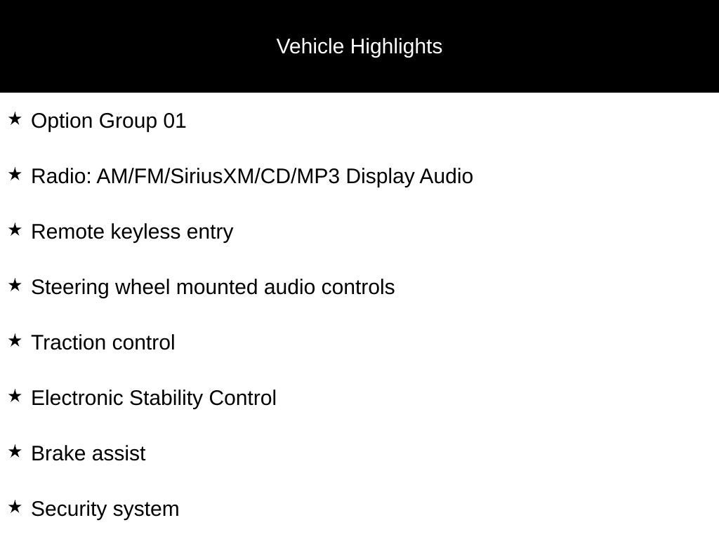 - Radio: AM/FM/SiriusXM/CD/MP3 Display Audio -inc: iPhone/USB and auxiliary jacks, 7-inch color touchscreen, Apple Car Play, Android Auto, HD Radio Technology w/multicasting, integrated Bluetooth® w/phonebook transfer and 6 speakers (2 front-door-mounted, 2 tweeters, and 2 rear)
