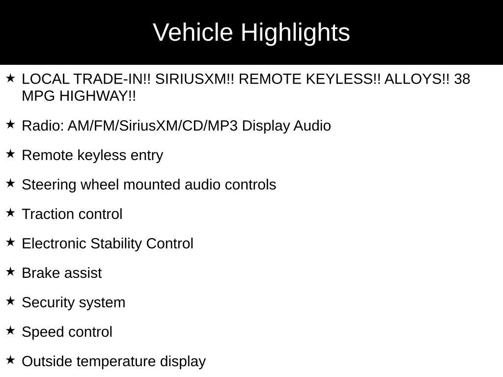 - LOCAL TRADE-IN!! SIRIUSXM!! REMOTE KEYLESS!! ALLOYS!! 38 MPG HIGHWAY!!