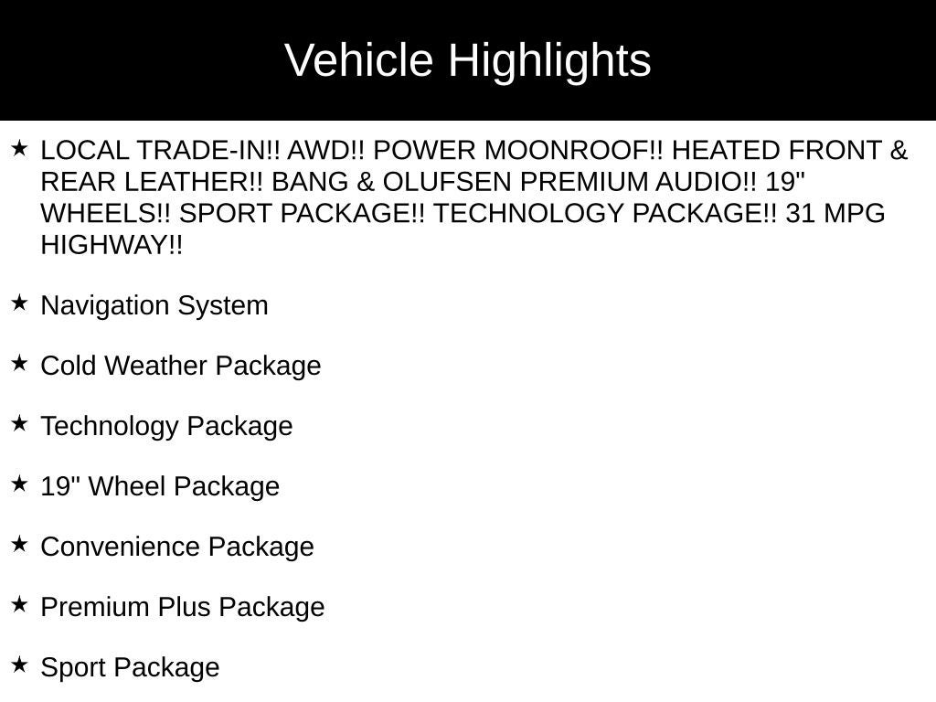- LOCAL TRADE-IN!! AWD!! POWER MOONROOF!! HEATED FRONT & REAR LEATHER!! BANG & OLUFSEN PREMIUM AUDIO!! 19" WHEELS!! SPORT PACKAGE!! TECHNOLOGY PACKAGE!! 31 MPG HIGHWAY!!