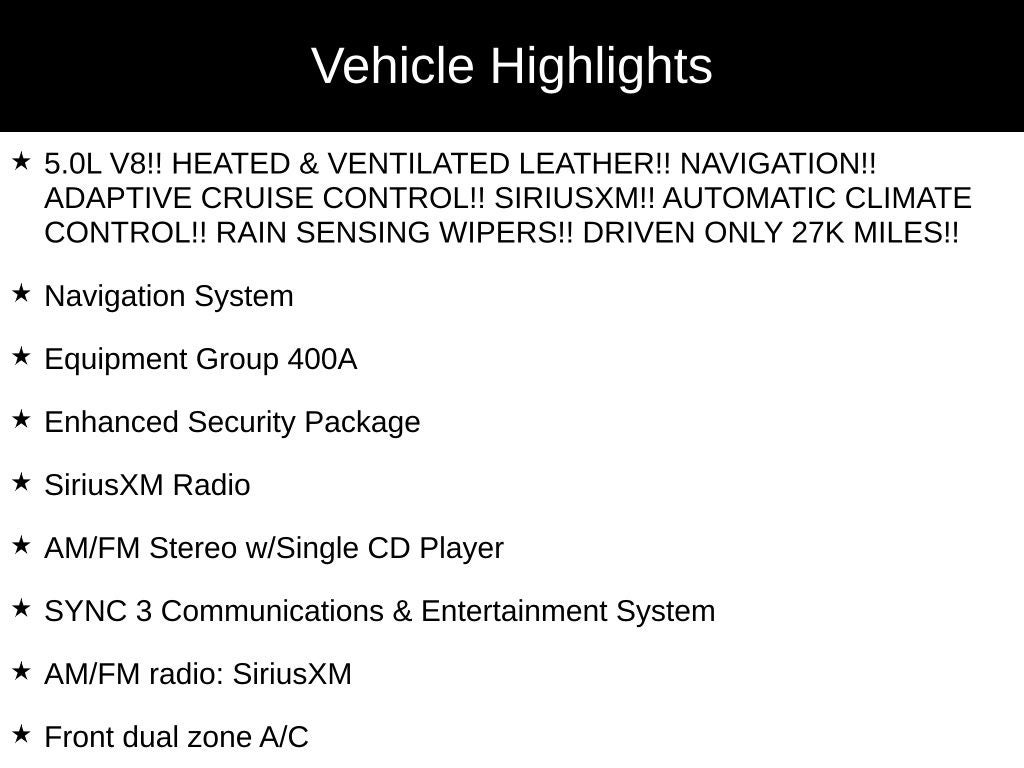 - 5.0L V8!! HEATED & VENTILATED LEATHER!! NAVIGATION!! ADAPTIVE CRUISE CONTROL!! SIRIUSXM!! AUTOMATIC CLIMATE CONTROL!! RAIN SENSING WIPERS!! DRIVEN ONLY 27K MILES!!