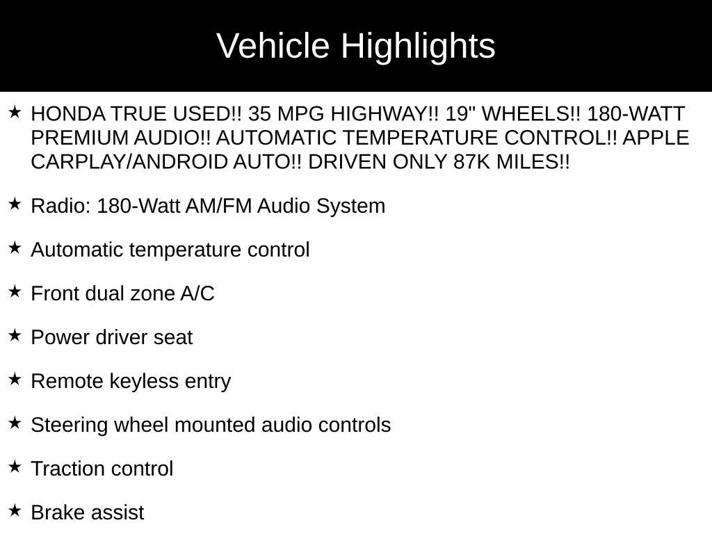 - Honda TRUE USED!! 35 MPG HIGHWAY!! 19" WHEELS!! 180-WATT PREMIUM AUDIO!! AUTOMATIC TEMPERATURE CONTROL!! APPLE CARPLAY/ANDROID AUTO!! DRIVEN ONLY 87K MILES!!