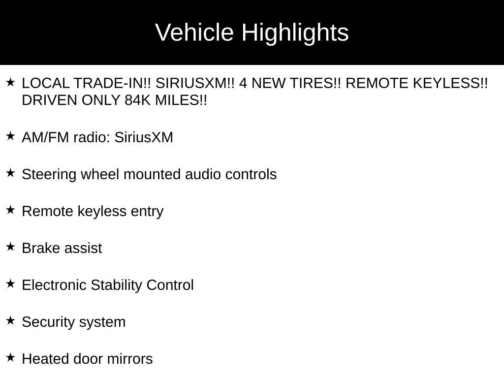 - LOCAL TRADE-IN!! SIRIUSXM!! 4 NEW TIRES!! REMOTE KEYLESS!! DRIVEN ONLY 84K MILES!!