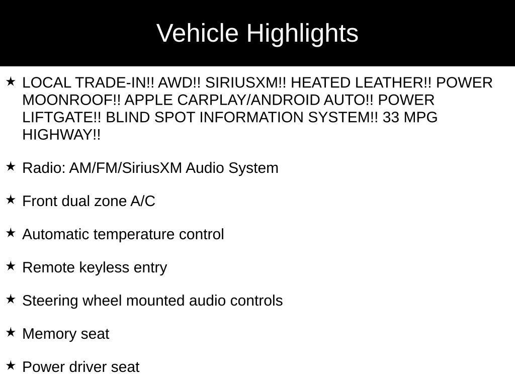 - LOCAL TRADE-IN!! AWD!! SIRIUSXM!! HEATED LEATHER!! POWER MOONROOF!! APPLE CARPLAY/ANDROID AUTO!! POWER LIFTGATE!! BLIND SPOT INFORMATION SYSTEM!! 33 MPG HIGHWAY!!