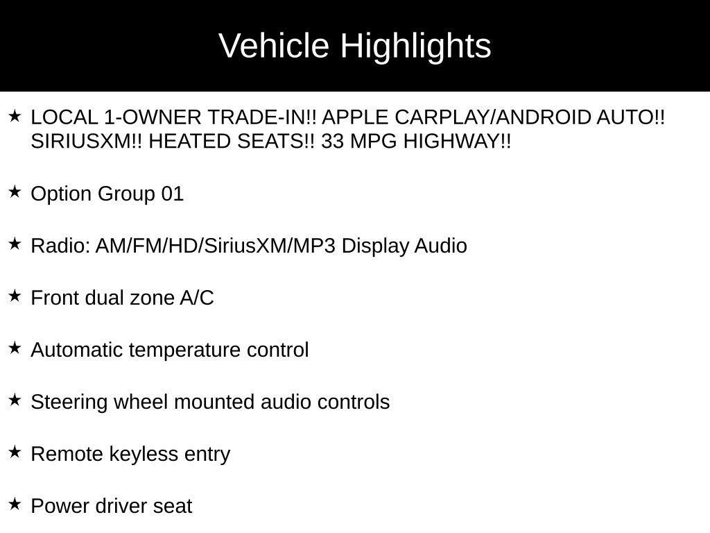 - LOCAL 1-OWNER TRADE-IN!! APPLE CARPLAY/ANDROID AUTO!! SIRIUSXM!! HEATED SEATS!! 33 MPG HIGHWAY!!