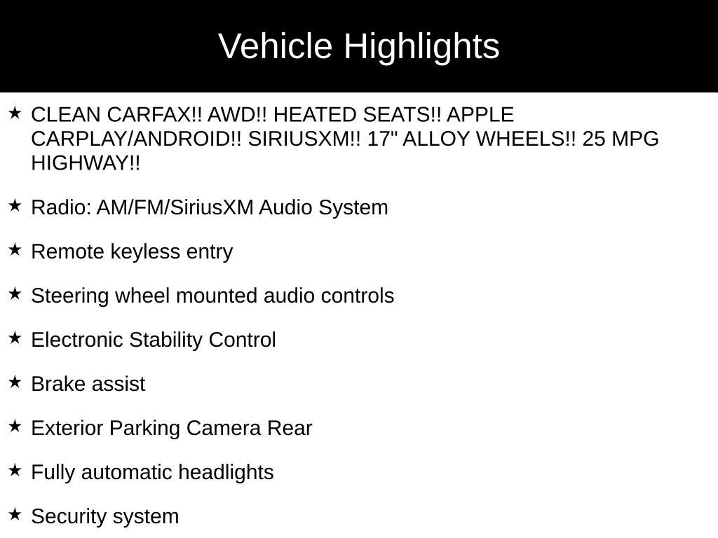 - CLEAN CARFAX!! AWD!! HEATED SEATS!! APPLE CARPLAY/ANDROID!! SIRIUSXM!! 17" ALLOY WHEELS!! 25 MPG HIGHWAY!!