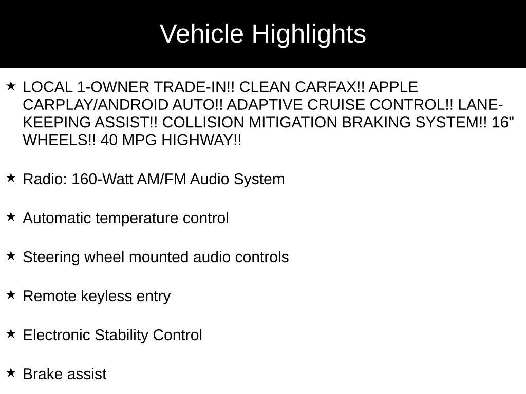 - LOCAL 1-OWNER TRADE-IN!! CLEAN CARFAX!! APPLE CARPLAY/ANDROID AUTO!! ADAPTIVE CRUISE CONTROL!! LANE-KEEPING ASSIST!! COLLISION MITIGATION BRAKING SYSTEM!! 16" WHEELS!! 40 MPG HIGHWAY!!