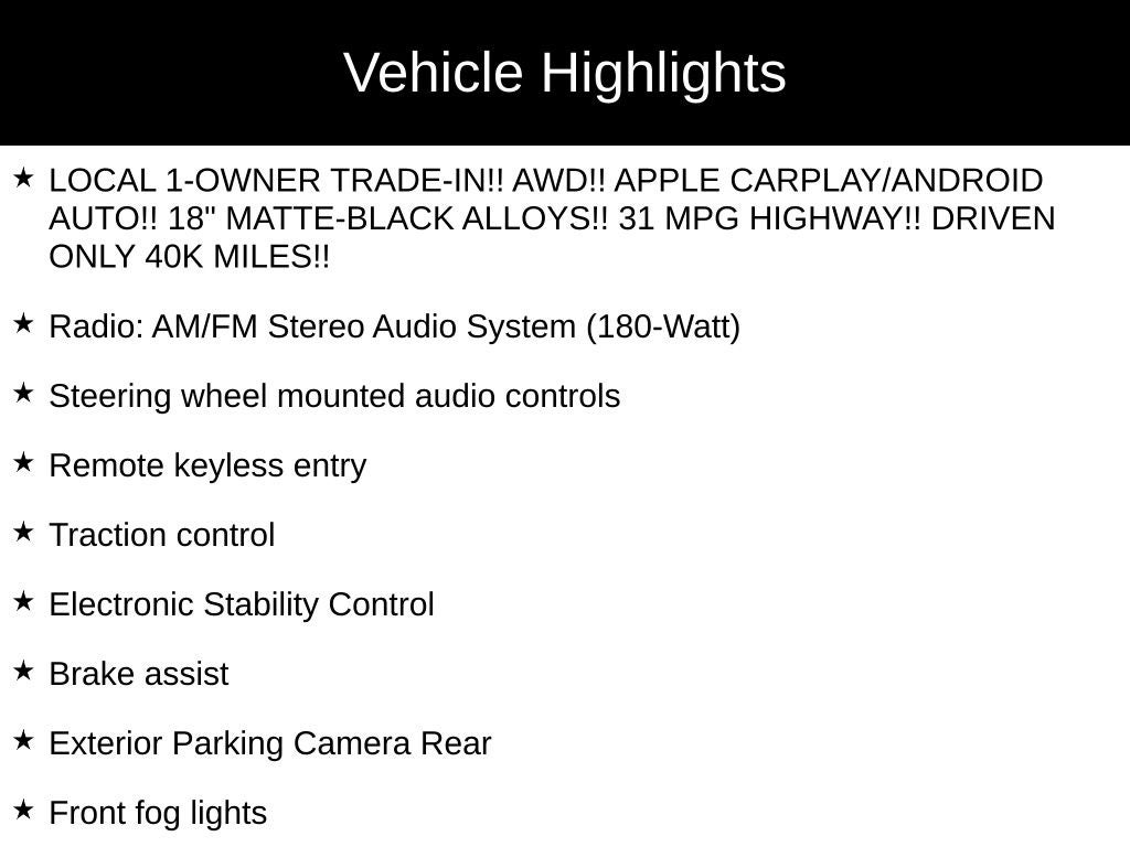 - LOCAL 1-OWNER TRADE-IN!! AWD!! APPLE CARPLAY/ANDROID AUTO!! 18" MATTE-BLACK ALLOYS!! 31 MPG HIGHWAY!! DRIVEN ONLY 40K MILES!!