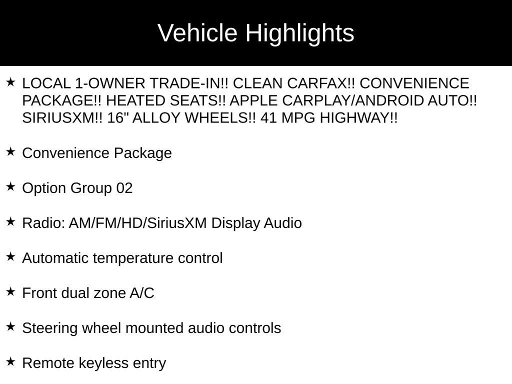 - LOCAL 1-OWNER TRADE-IN!! CLEAN CARFAX!! CONVENIENCE PACKAGE!! HEATED SEATS!! APPLE CARPLAY/ANDROID AUTO!! SIRIUSXM!! 16" ALLOY WHEELS!! 41 MPG HIGHWAY!!