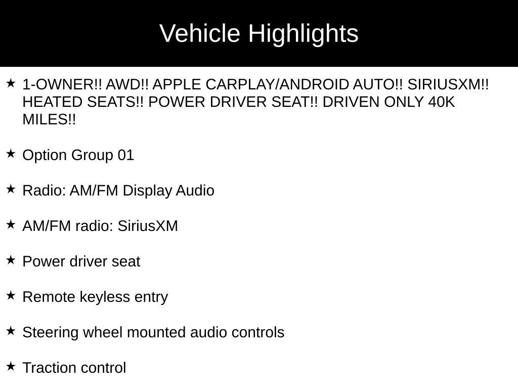 - 1-OWNER!! AWD!! APPLE CARPLAY/ANDROID AUTO!! SIRIUSXM!! HEATED SEATS!! POWER DRIVER SEAT!! DRIVEN ONLY 40K MILES!!