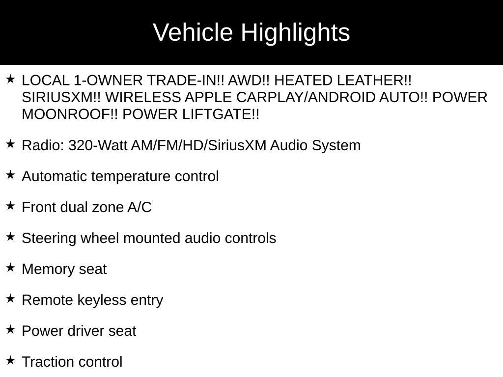 - LOCAL 1-OWNER TRADE-IN!! AWD!! HEATED LEATHER!! SIRIUSXM!! WIRELESS APPLE CARPLAY/ANDROID AUTO!! POWER MOONROOF!! POWER LIFTGATE!!