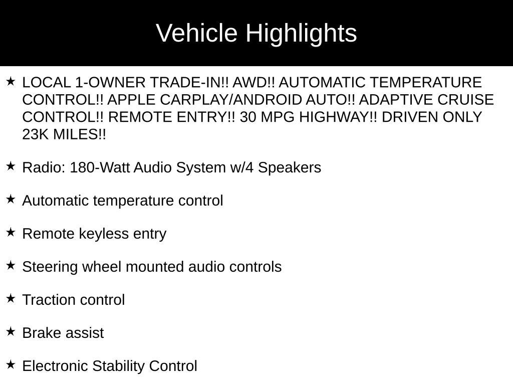 - LOCAL 1-OWNER TRADE-IN!! AWD!! AUTOMATIC TEMPERATURE CONTROL!! APPLE CARPLAY/ANDROID AUTO!! ADAPTIVE CRUISE CONTROL!! REMOTE ENTRY!! 30 MPG HIGHWAY!! DRIVEN ONLY 23K MILES!!