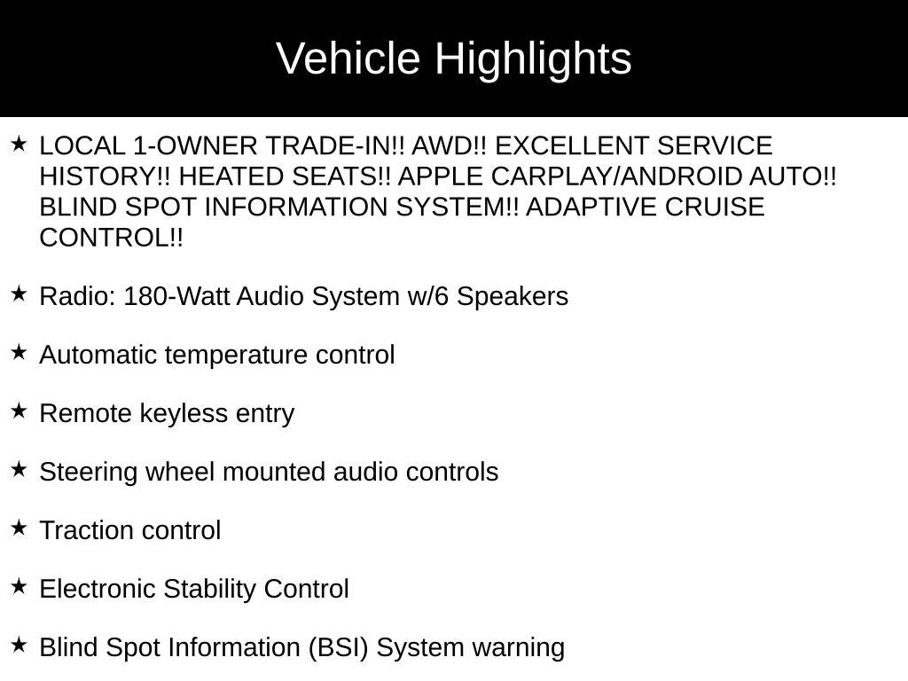 - LOCAL 1-OWNER TRADE-IN!! AWD!! EXCELLENT SERVICE HISTORY!! HEATED SEATS!! APPLE CARPLAY/ANDROID AUTO!! BLIND SPOT INFORMATION SYSTEM!! ADAPTIVE CRUISE CONTROL!!