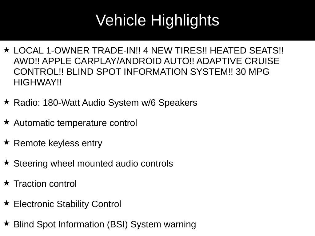 - LOCAL 1-OWNER TRADE-IN!! HEATED SEATS!! AWD!! APPLE CARPLAY/ANDROID AUTO!! ADAPTIVE CRUISE CONTROL!! BLIND SPOT INFORMATION SYSTEM!! 30 MPG HIGHWAY!!