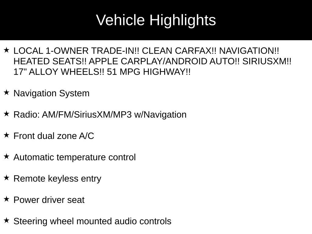 - LOCAL 1-OWNER TRADE-IN!! CLEAN CARFAX!! NAVIGATION!! HEATED SEATS!! APPLE CARPLAY/ANDROID AUTO!! SIRIUSXM!! 17" ALLOY WHEELS!! 51 MPG HIGHWAY!!