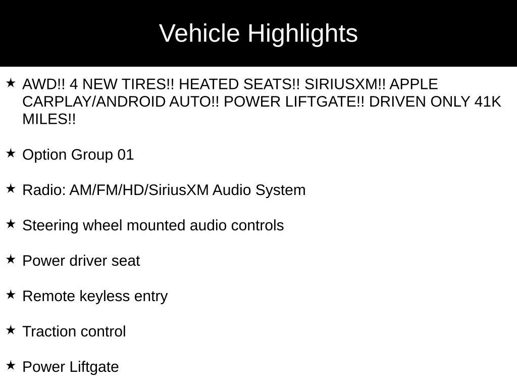 - AWD!! 4 NEW TIRES!! HEATED SEATS!! SIRIUSXM!! APPLE CARPLAY/ANDROID AUTO!! POWER LIFTGATE!! DRIVEN ONLY 41K MILES!!