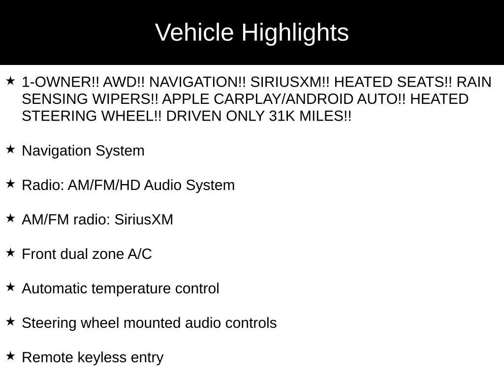- 1-OWNER!! AWD!! NAVIGATION!! SIRIUSXM!! HEATED SEATS!! RAIN SENSING WIPERS!! APPLE CARPLAY/ANDROID AUTO!! HEATED STEERING WHEEL!! DRIVEN ONLY 31K MILES!!