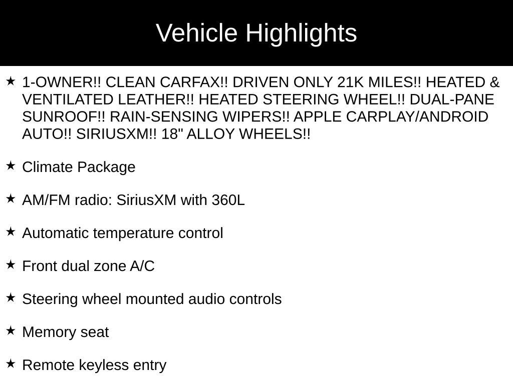 - 1-OWNER!! CLEAN CARFAX!! DRIVEN ONLY 21K MILES!! HEATED & VENTILATED LEATHER!! HEATED STEERING WHEEL!! DUAL-PANE SUNROOF!! RAIN-SENSING WIPERS!! APPLE CARPLAY/ANDROID AUTO!! SIRIUSXM!! 18" ALLOY WHEELS!!
