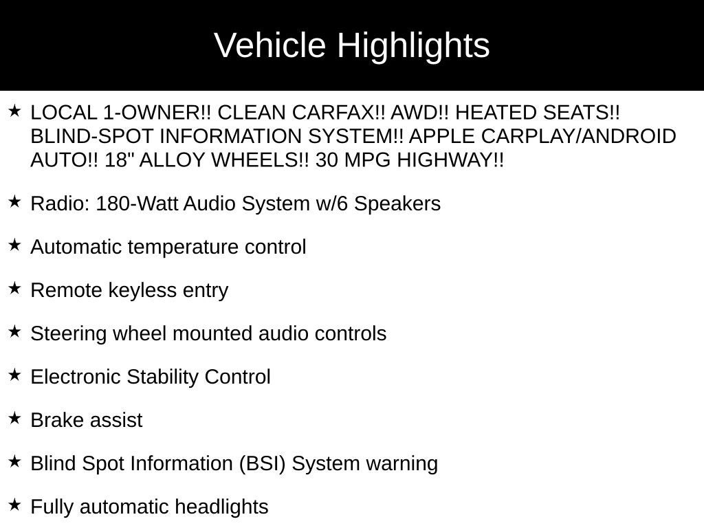 - LOCAL 1-OWNER!! CLEAN CARFAX!! AWD!! HEATED SEATS!! BLIND-SPOT INFORMATION SYSTEM!! APPLE CARPLAY/ANDROID AUTO!! 18" ALLOY WHEELS!! 30 MPG HIGHWAY!!