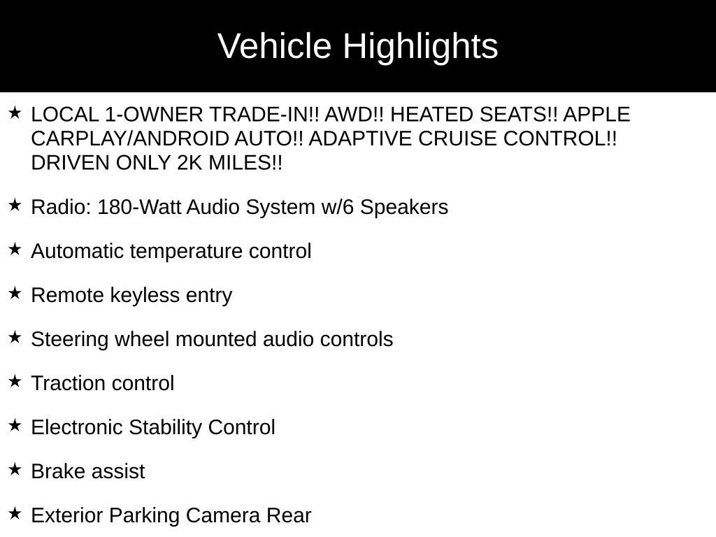 - LOCAL 1-OWNER TRADE-IN!! AWD!! HEATED SEATS!! APPLE CARPLAY/ANDROID AUTO!! ADAPTIVE CRUISE CONTROL!! DRIVEN ONLY 2K MILES!!
