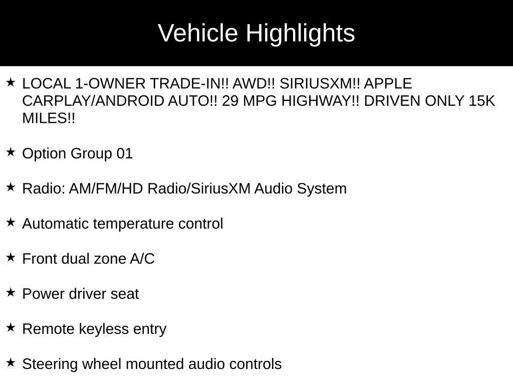 - LOCAL 1-OWNER TRADE-IN!! AWD!! SIRIUSXM!! APPLE CARPLAY/ANDROID AUTO!! 29 MPG HIGHWAY!! DRIVEN ONLY 15K MILES!!